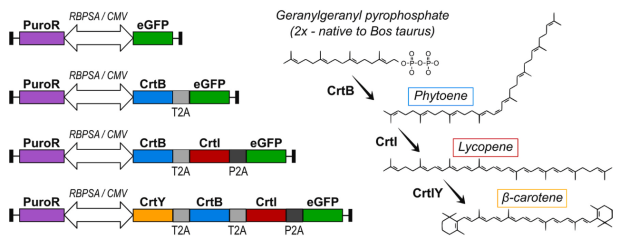 Генетические конструкции, встраиваемые в клетки с помощью Sleeping beauty, и соответствующие продукты в биосинтезе каротиноидов. В каждой конструкции с одной стороны от синтетического двунаправленного промотора RBPSA/CMV имеется ген устойчивости к пуромицину (PuroR) в качестве селективного маркера, с другой стороны — целевые гены (фитоенсинтазы (CrtB), фитоендесатуразы (CrtI) и ликопинциклазы (CrtY)) с встроенными между ними последовательностями 2А-пептидов и репортерным GFP на конце (eGFP). 2А-пептиды в составе полипептидной цепи способны к самовырезанию, что в данном случаем обеспечивает в итоге работу нескольких отдельных ферментов, закодированных в полицистронной последовательности. В контрольную группу клеток встраивали конструкцию без целевых генов.