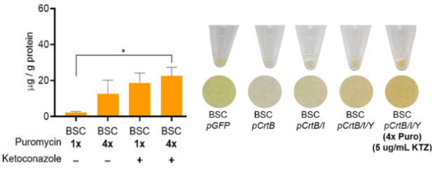 Для устранения этой проблемы было решено оптимизировать синтез каротиноидов в CrtB/I/Y-клетках, причем двумя способами. Первый заключался в усилении селективного давления на трансгенные клетки: концентрацию пуромицина в среде для селекции увеличили в четыре раза (до 10 микрограммов на миллилитр), так как при такой концентрации ученые заметили усиление экспрессии GFP при отсутствии значимых изменений в выживаемости клеток. Второй способ — накопление прекурсоров каротиноидов за счет ингибирования синтеза холестерина кетоконазолом (пять микрограммов на миллилитр). Смысл в том, что и холестерин, и каротиноиды имеют общих предшественников, и в случае, если синтез первого будет приостановлен, у прекурсоров будет больше шансов пойти по каротиноидному метаболическому пути.